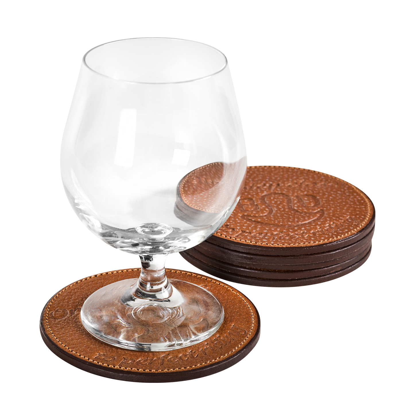 Follow your passion for the iconic Bruno Delgrange brand. Here is a set of 6 coasters made of full-grain leather with constrasting piping. The front of each coaster is embossed with the Bruno Delgrange brand and logo. The outer edge is accentuated with a fine saddle stitch. You will be able to share an exquisite moment with your guests after a long day!